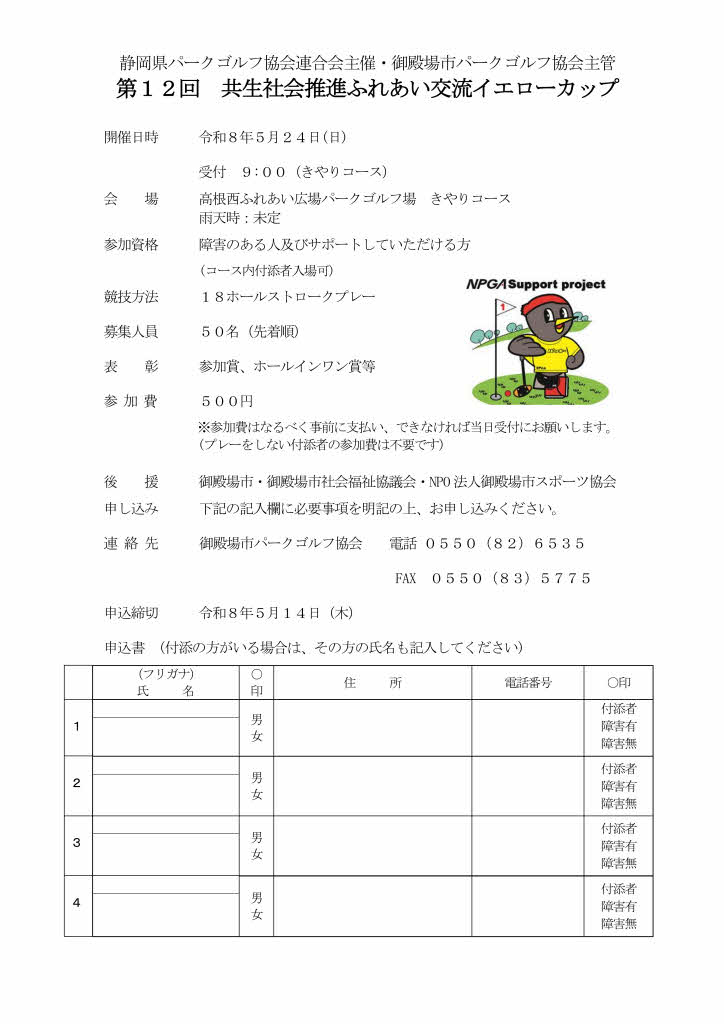 第12回共生社会推進ふれあい交流イエローカップ開催のお知らせ(パークゴルフ) 更新日: 2026年4月5日 Posted on 2026年4月5日 文字サイズ: S M L XL 第12回共生社会推進ふれあい交流イエローカップ(パークゴルフ)が令和8年5月24日(日)に高根西ふれあい広場パークゴルフ場で開催されます。参加を希望する方は開催要項をご覧いただき所定の方法でお申込み下さい。 【静岡県】第12回イエローカップ募集案内